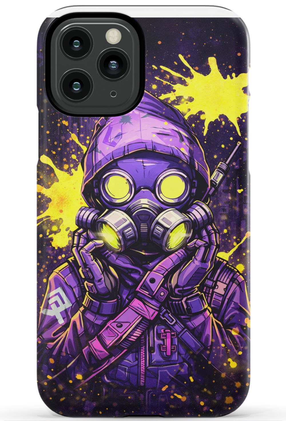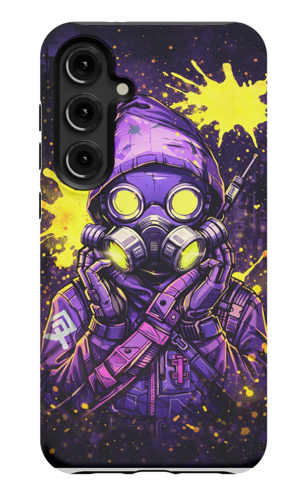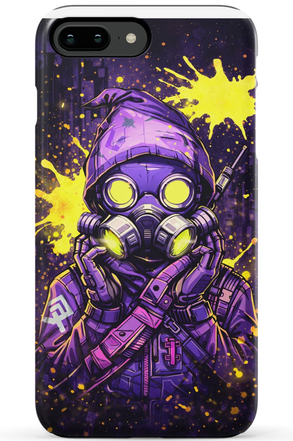 Masked figure in cyberpunk cityscape