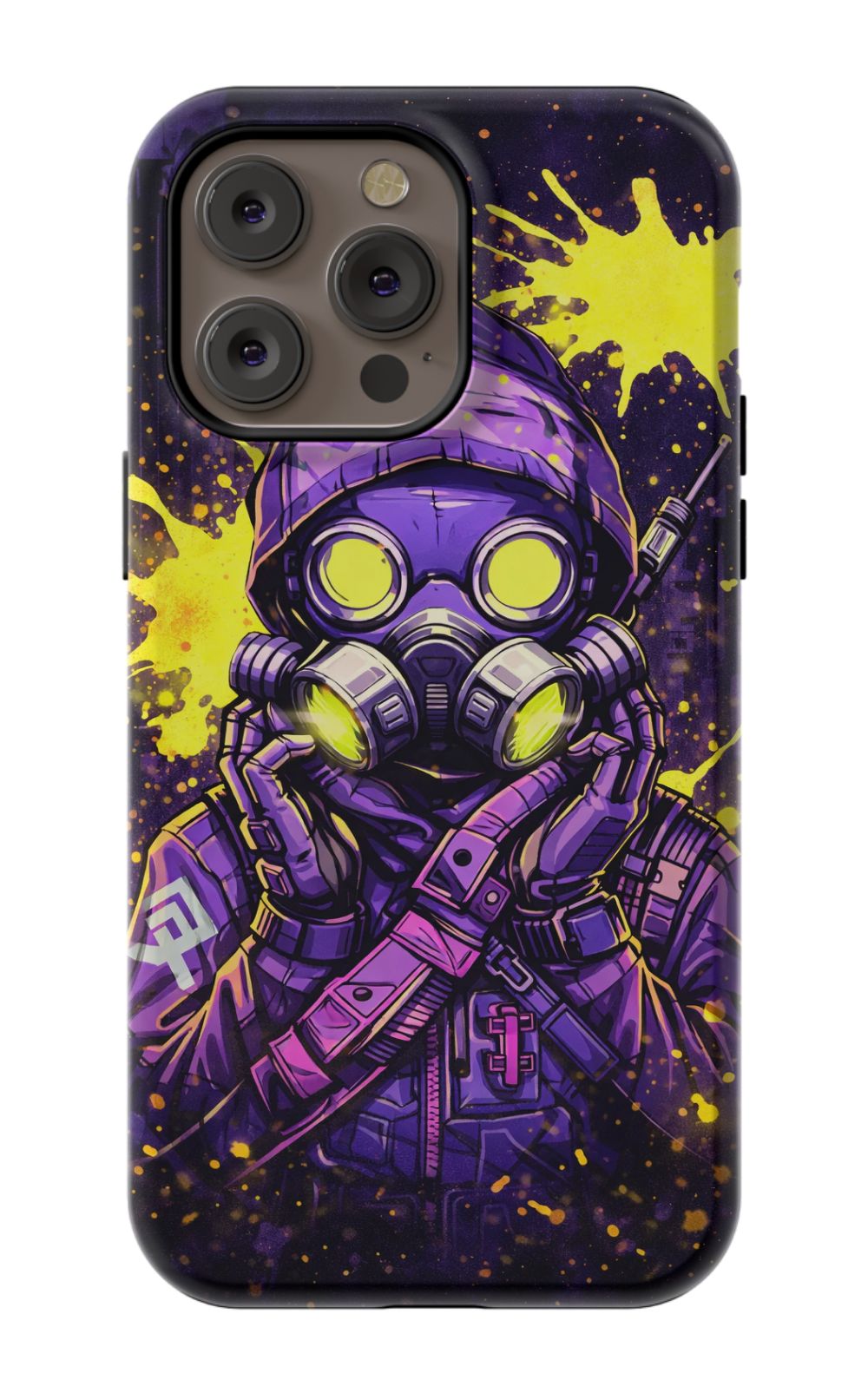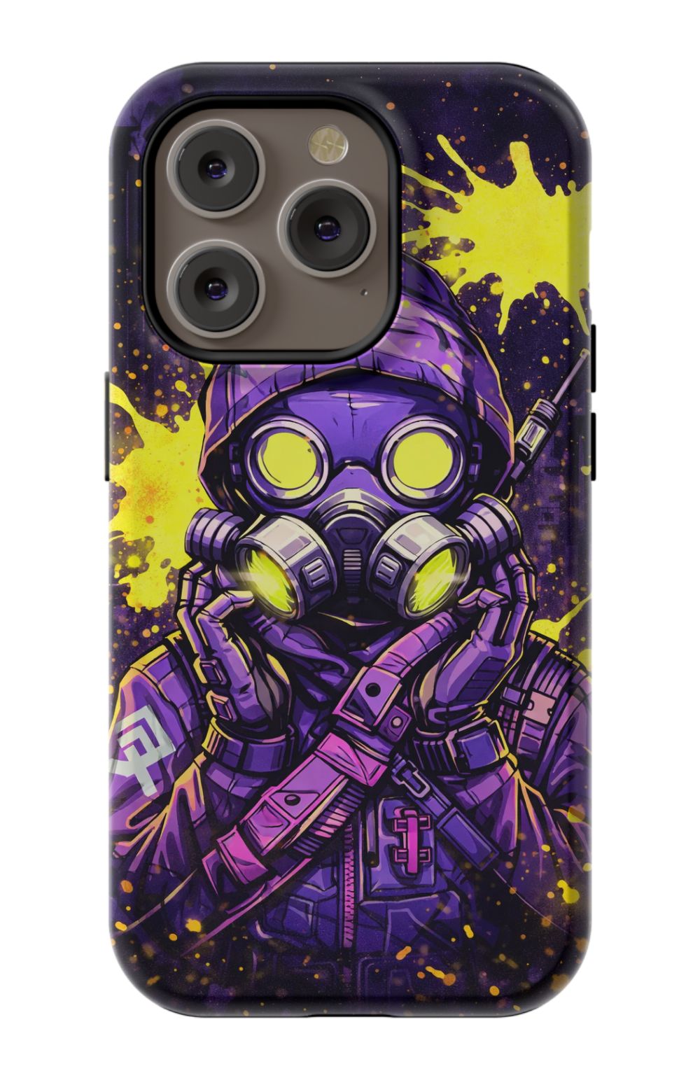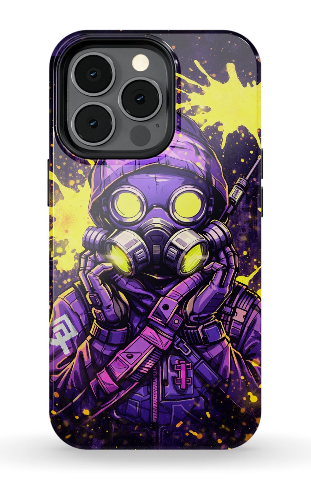 Masked figure in cyberpunk cityscape